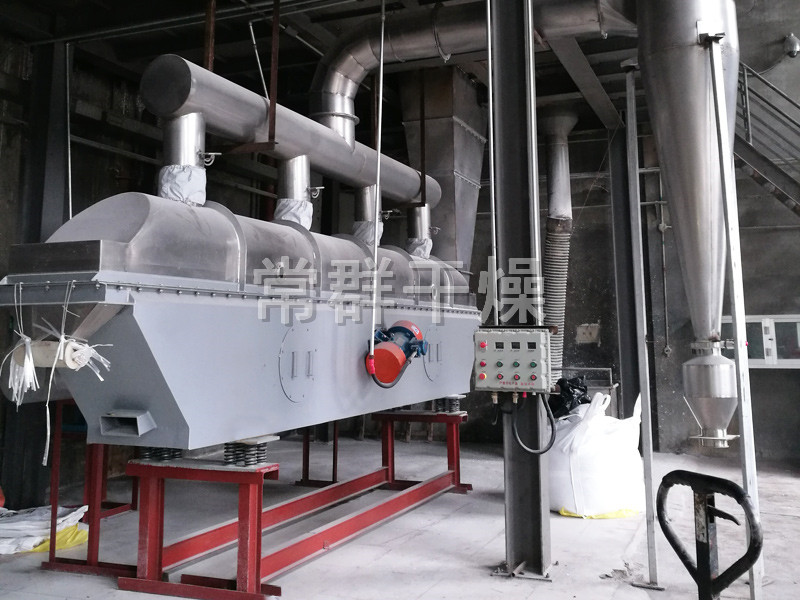 物料自進料進口進入機內,在振動力作用下,物料沿水平面流化床拋擲,向前連續(xù)運動,熱風向上穿過流化床同濕物料換熱后,濕空氣經(jīng)旋風分離器除塵后由排風1:3排出,干燥物料由排料進口排出。