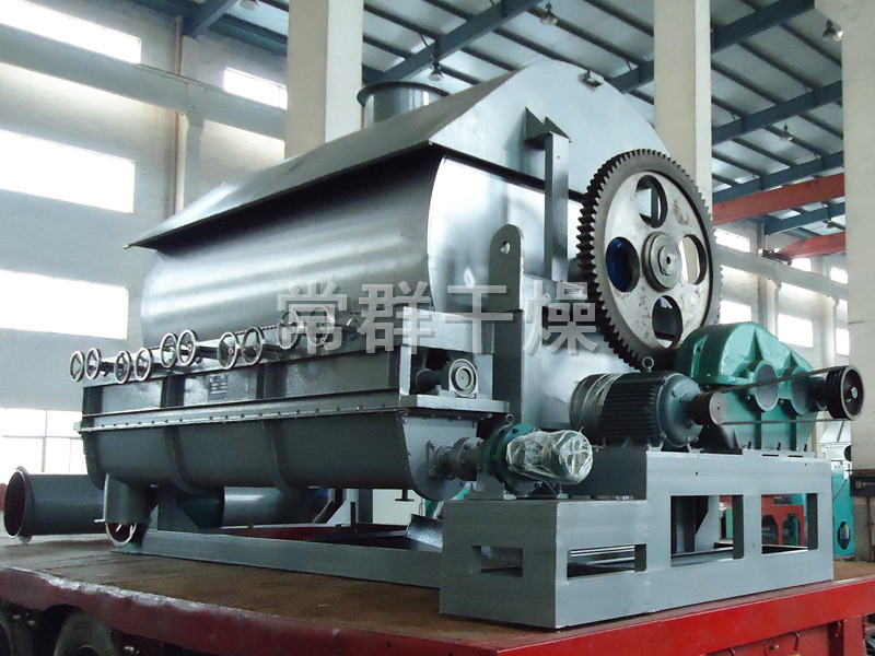 滾筒干燥機(jī)是一種內(nèi)加熱傳導(dǎo)型轉(zhuǎn)動(dòng)連續(xù)干燥設(shè)備。旋轉(zhuǎn)的滾筒通過其下部料槽,粘附著一厚度的料膜,熱量通過管道輸送至滾筒內(nèi)壁,傳導(dǎo)到滾筒外壁,再傳導(dǎo)給料膜,使料膜中的濕得到蒸發(fā)、脫濕,使含濕分的物料得到干燥。干燥好的物料被裝置在滾筒表面的刮刀鏟離滾筒,到置于刮刀下方的螺旋輸送器,通過螺旋輸送器將干物料集中、包裝。