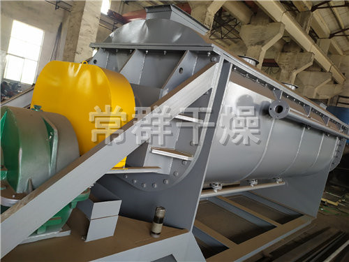 在漿葉及夾套通入 蒸汽,加熱的同時(shí),出料口上部同時(shí)通入經(jīng)過(guò)加熱后的干空氣進(jìn)一步干燥,這樣大大增加了設(shè)備的干燥強(qiáng)度。蒸發(fā)出來(lái)的水分由尾氣帶出干燥機(jī),濕空氣由引風(fēng)機(jī)排出室外。